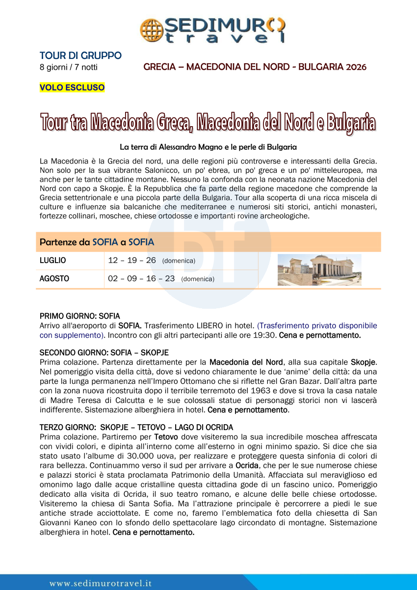 Tour tra Macedonia Greca, Macedonia del Nord e Bulgaria da Sofia 8 giorni